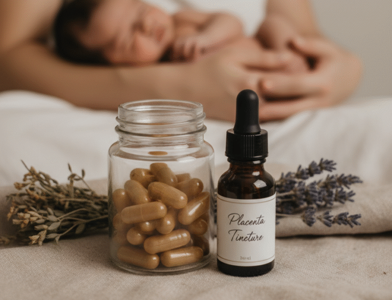 Apoyo natural para la recuperación posparto mediante cápsulas o tintura de placenta.